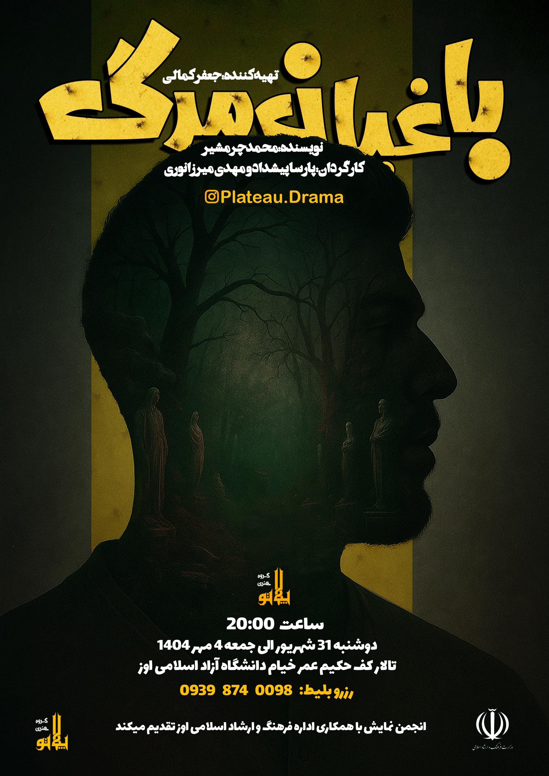 نمایش «باغبان مرگ» به نویسندگی محمد چرمشیر و تهیهکنندگی جعفر کمالی از ۳۱ شهریور تا ۴ مهر ۱۴۰۴ در تالار کف حکیم عمر خیام دانشگاه آزاد اسلامی اوز اجرا میشود.